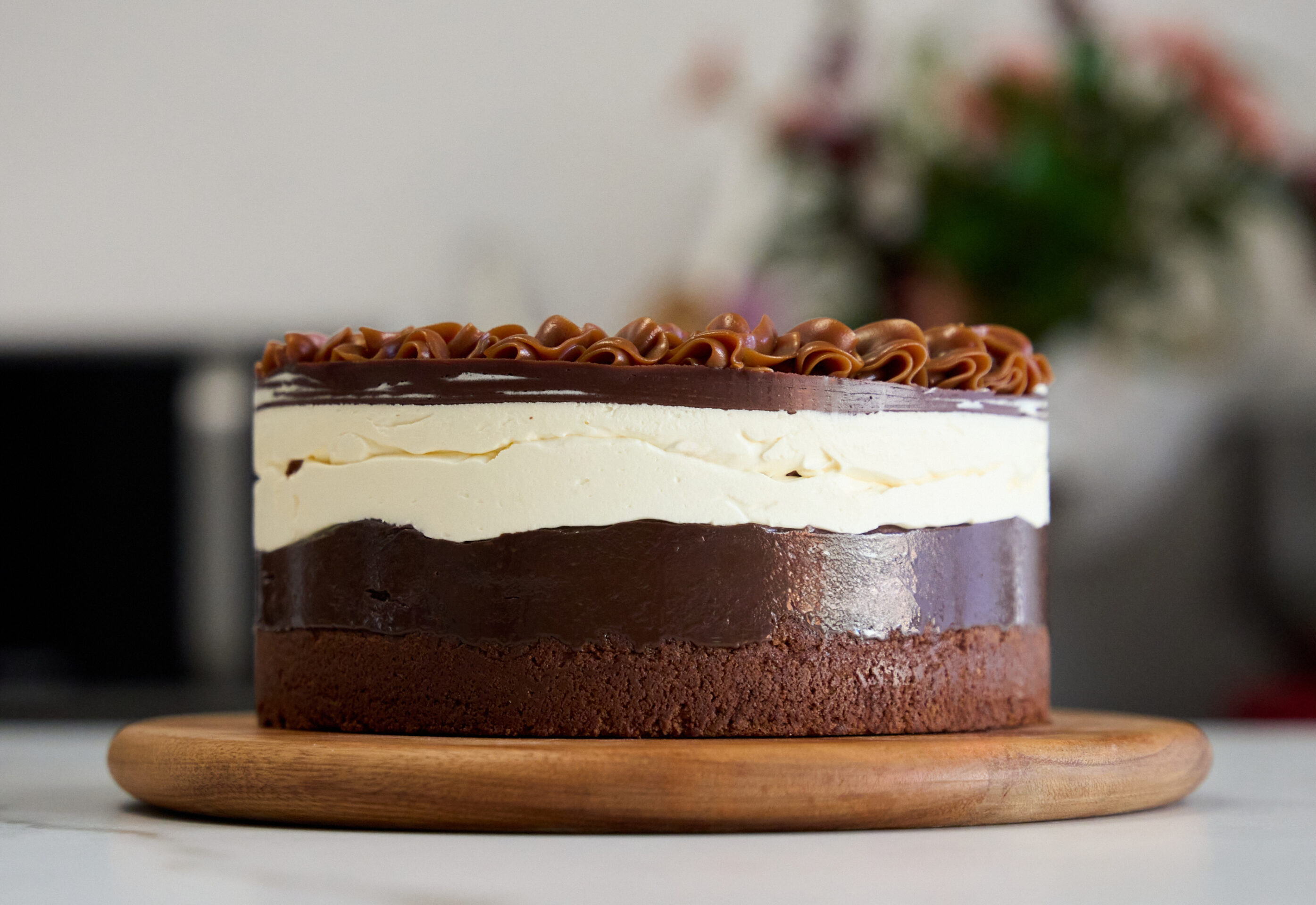 Doble bizcocho de chocolate semi amargo, crema de avellanas, dulce de leche, doble capa de crema chantilly y ganache de chocolate. ¡Esta torta no lleva harina!