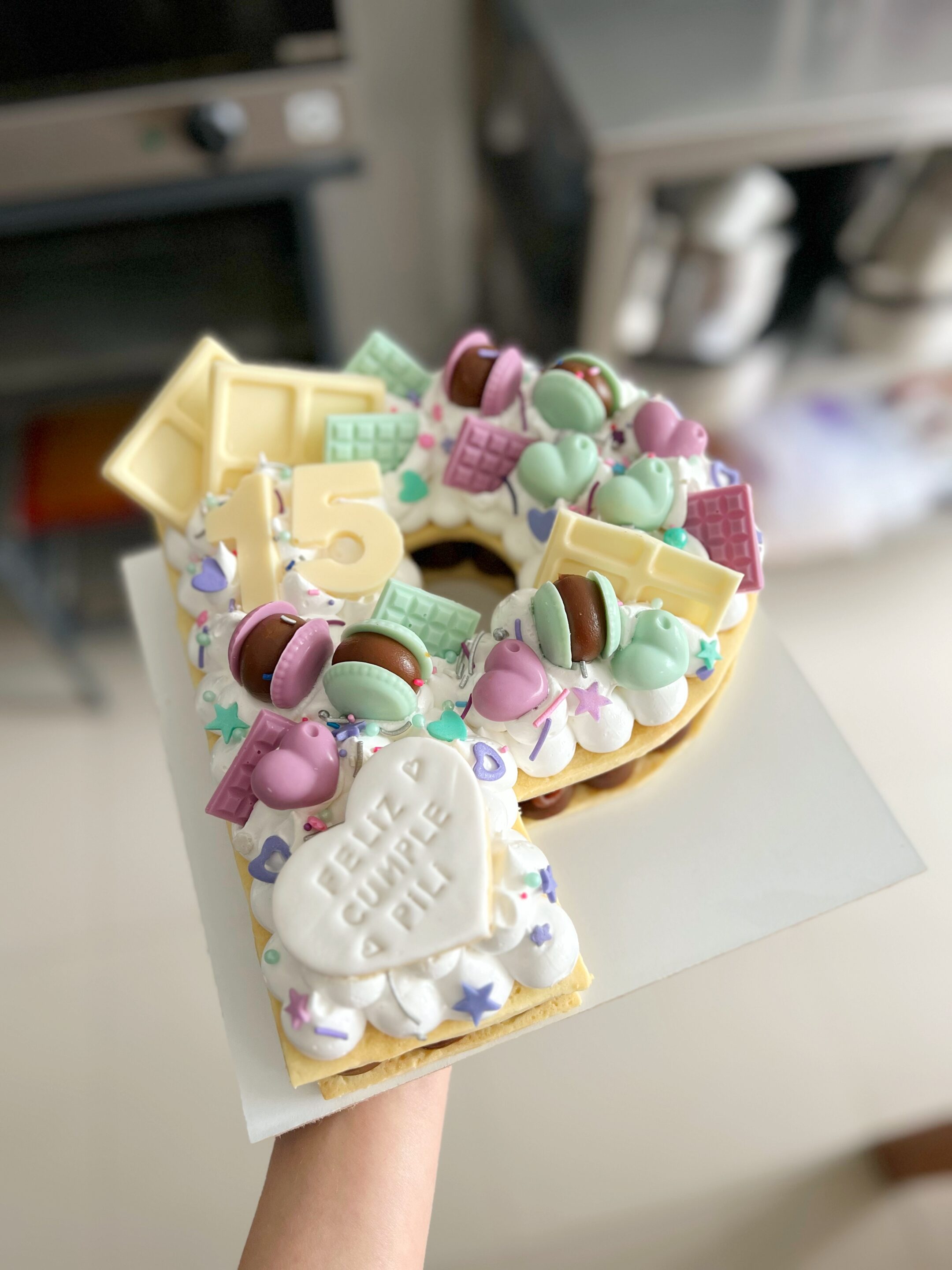 Decorada con chocolates, cookies y sprinkles.