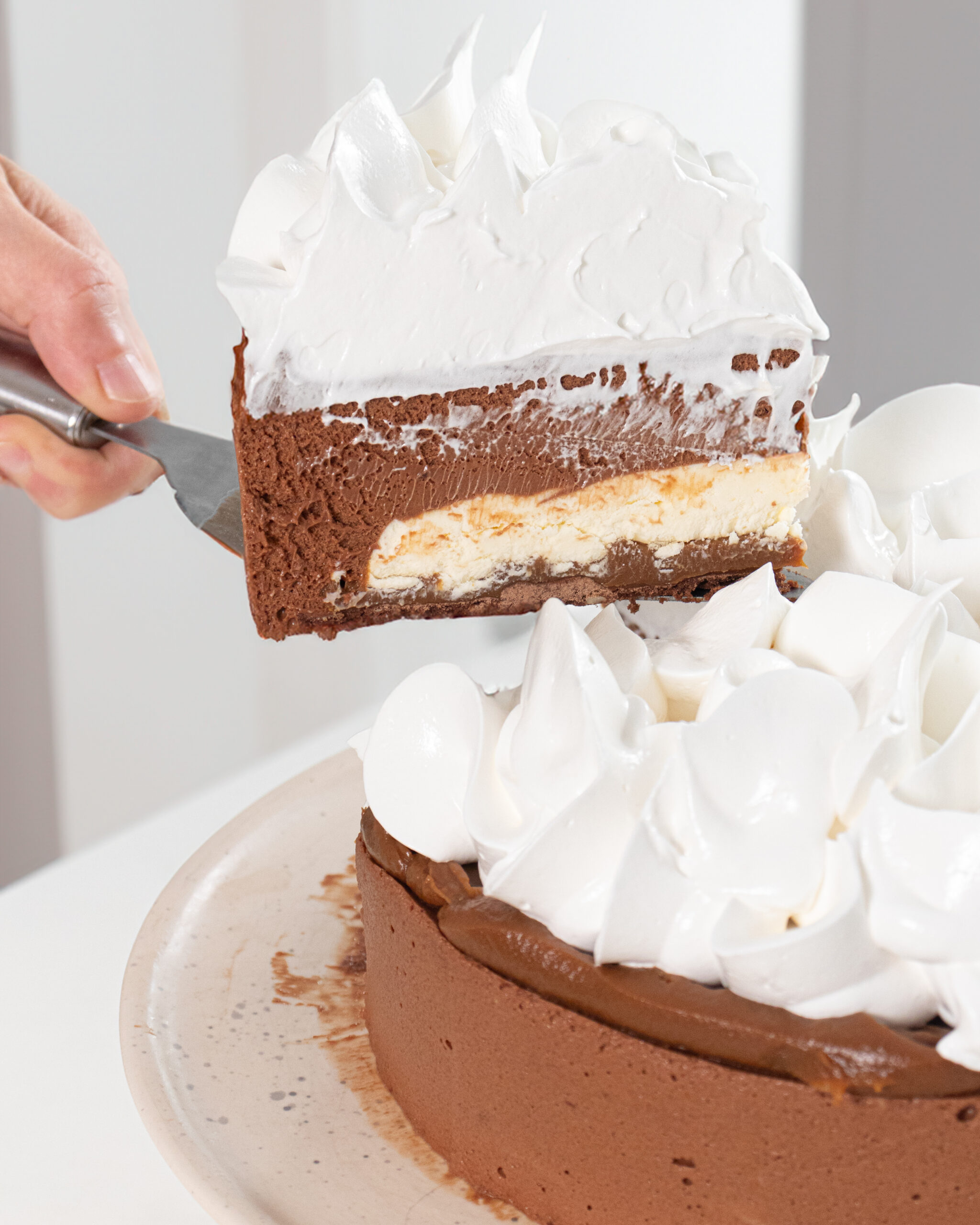 Mousse de chocolate, con interior escondido de una crocante sablée de cacao, dulce de leche y crema chantilly. Terminación con merengue italiano.