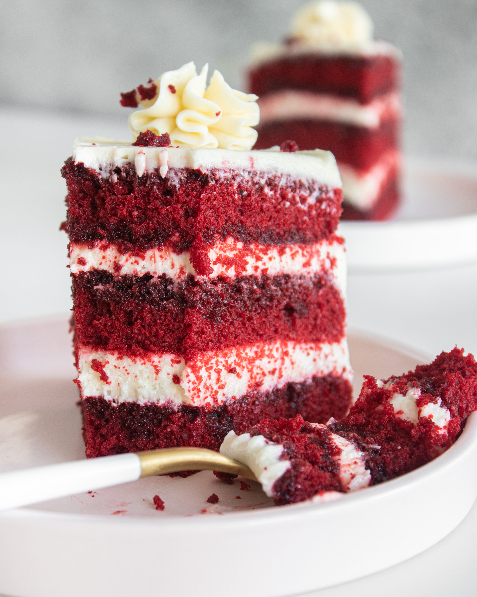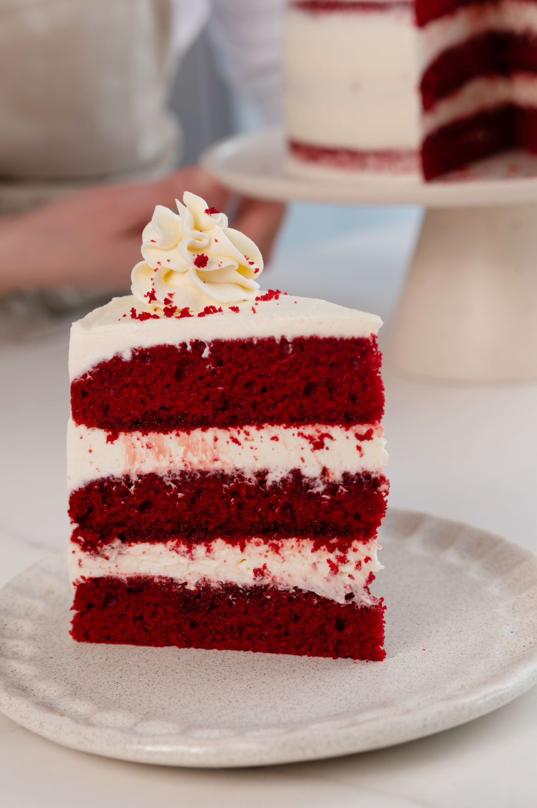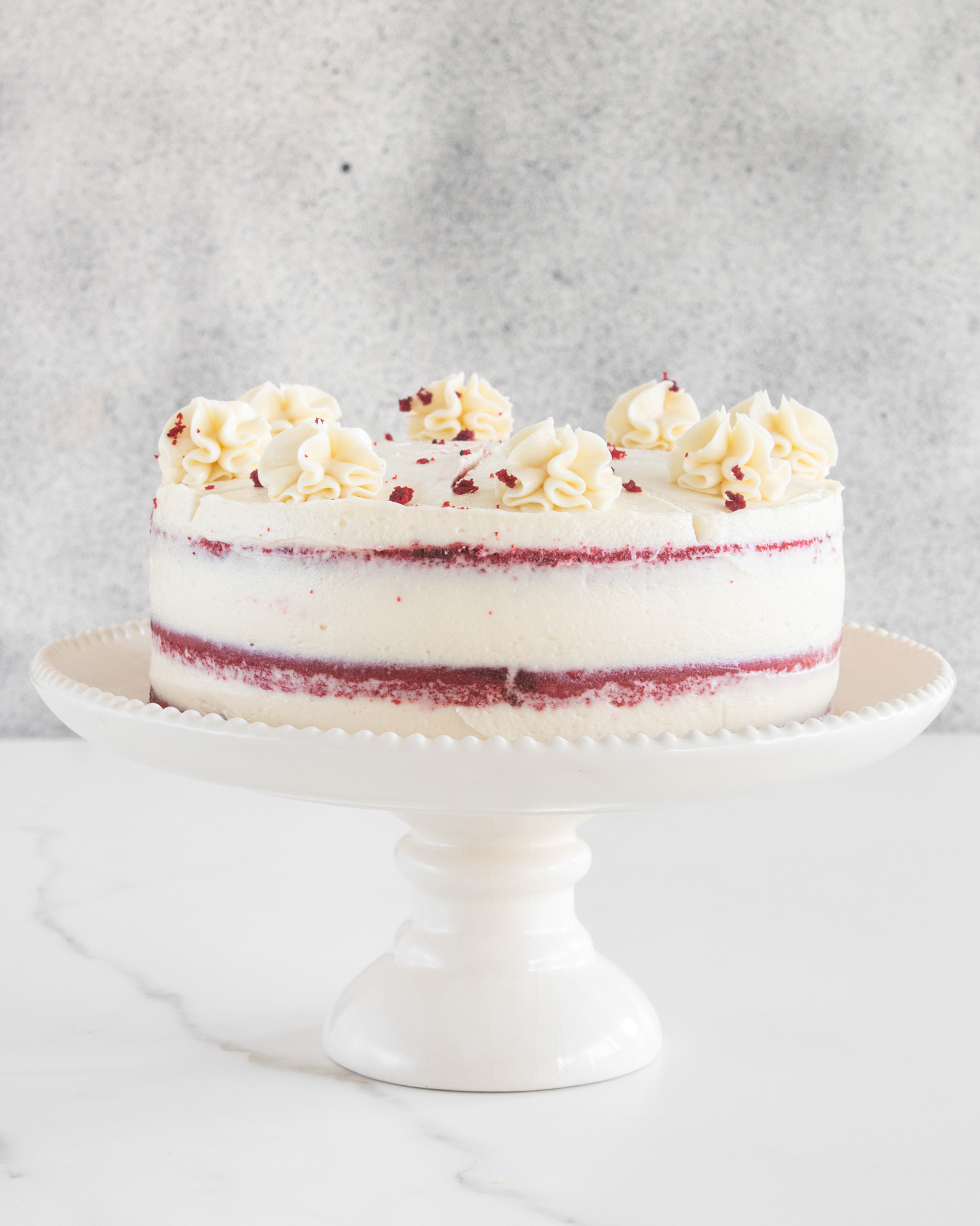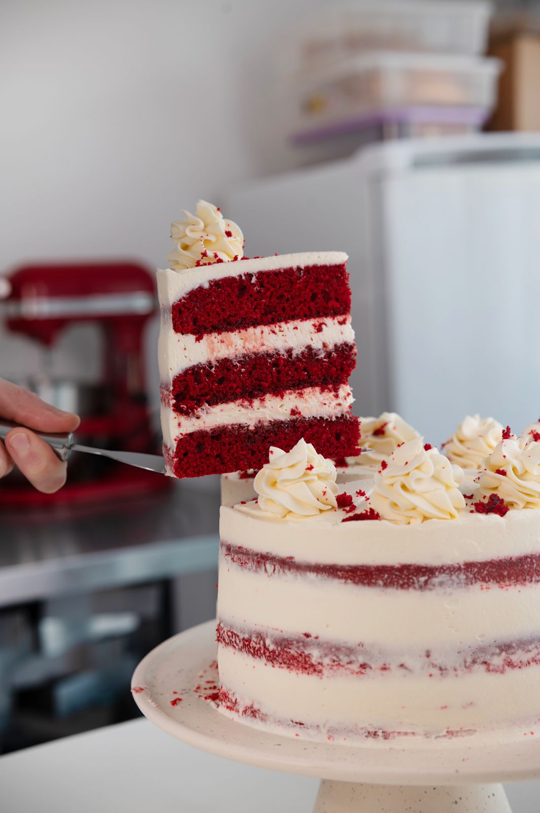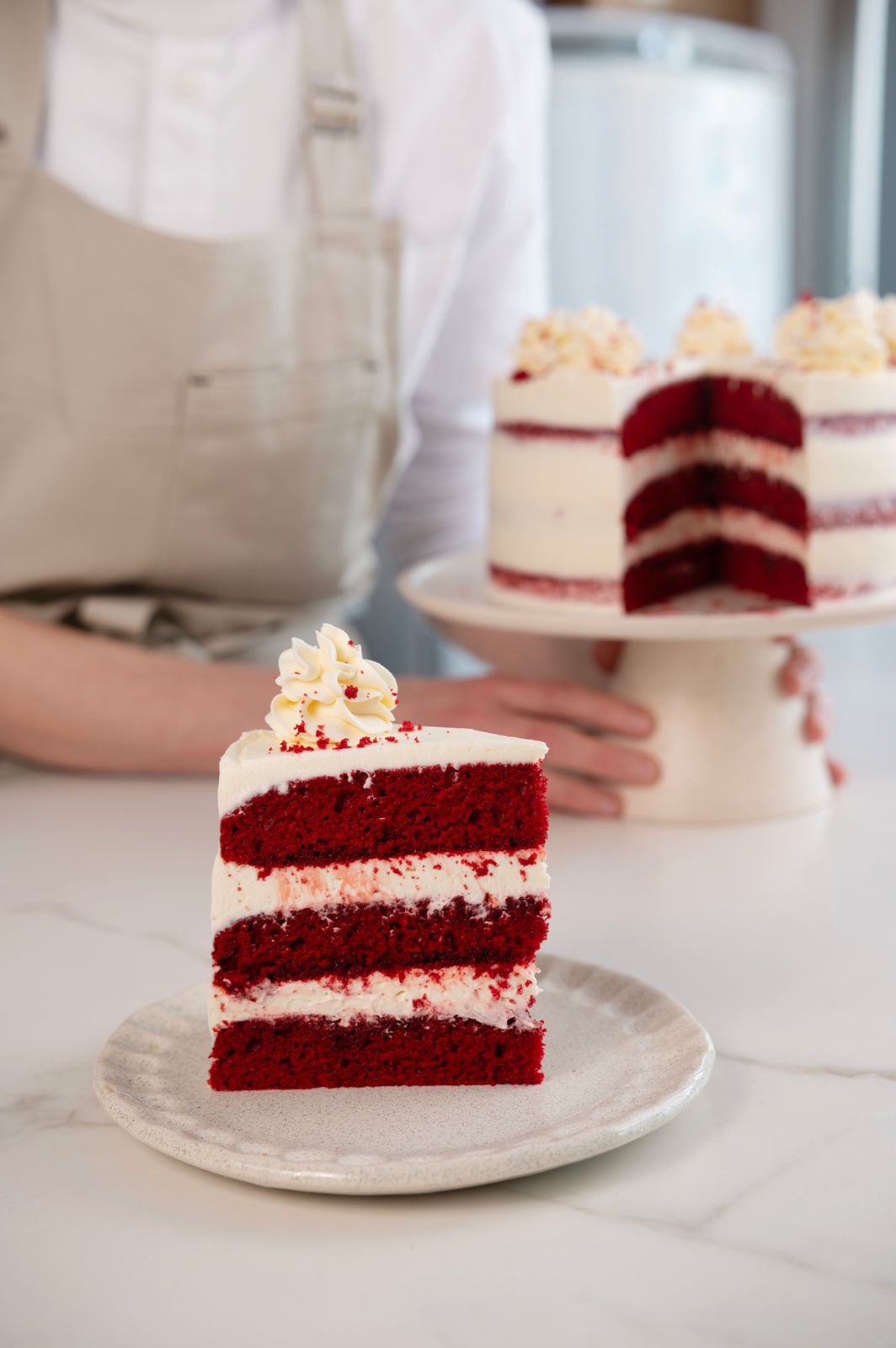 Tres bizcochos húmedos con un suave sabor a chocolate, rellenos y cubiertos por un suave frosting de queso (sin manteca).