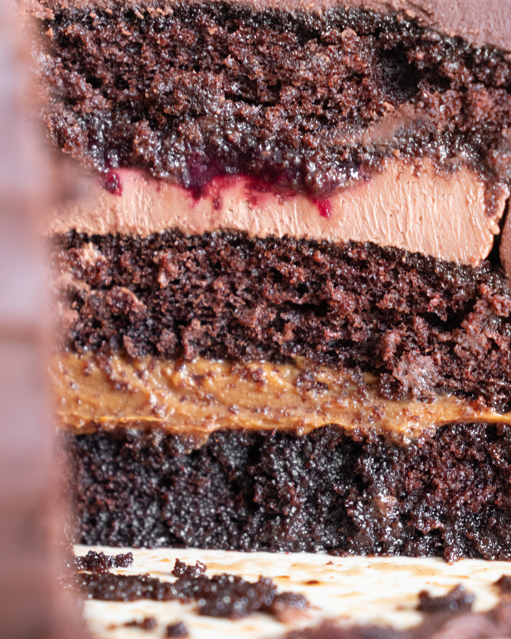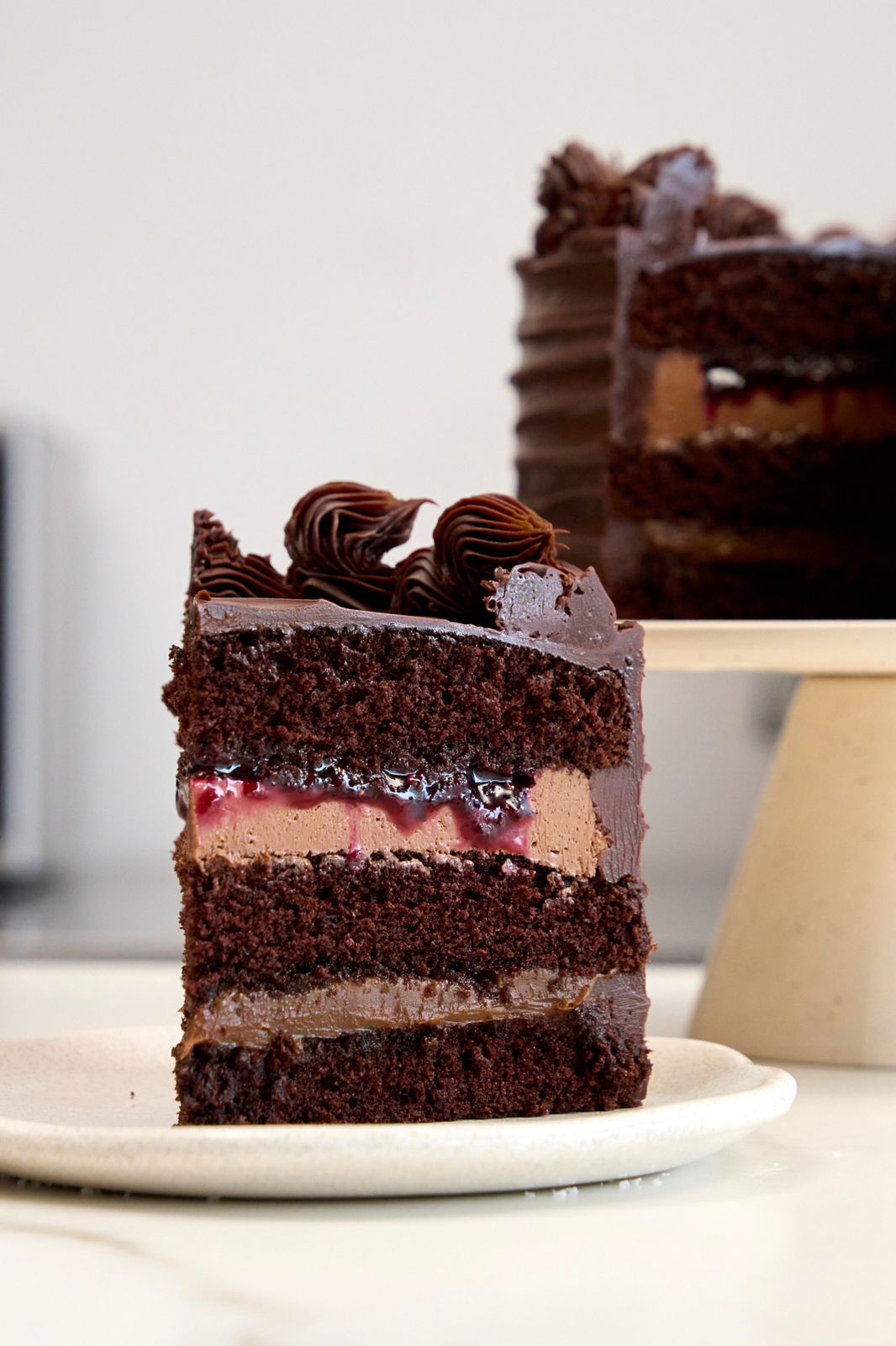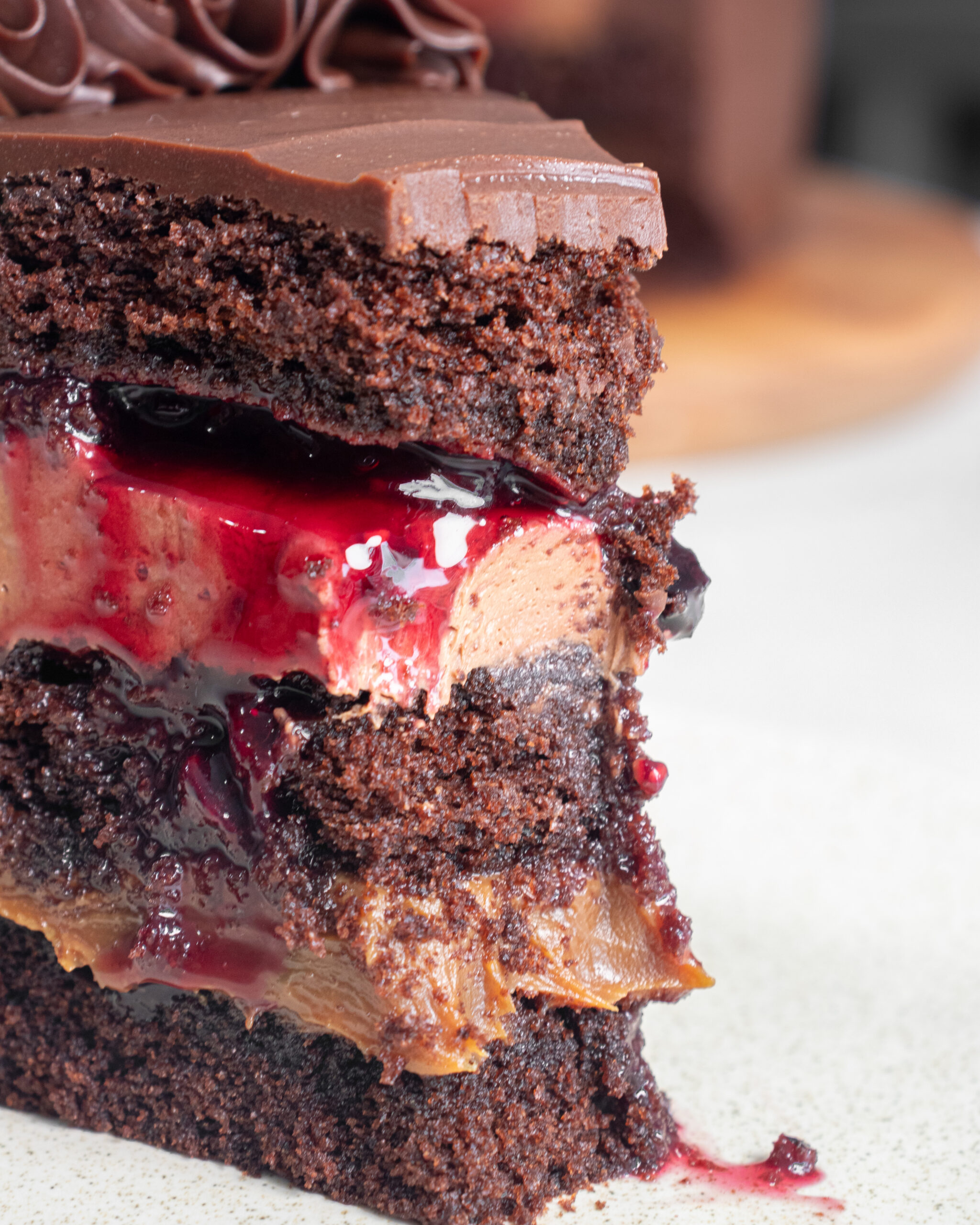 Tres bizcochos húmedos de chocolate cubiertos con una deliciosa ganache de chocolate semiamargo.