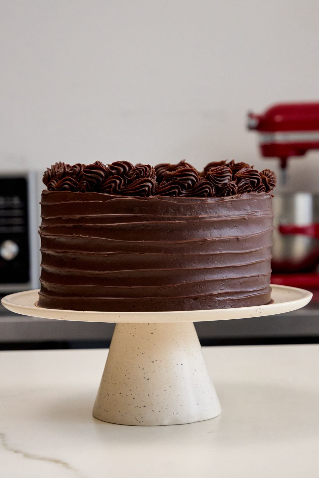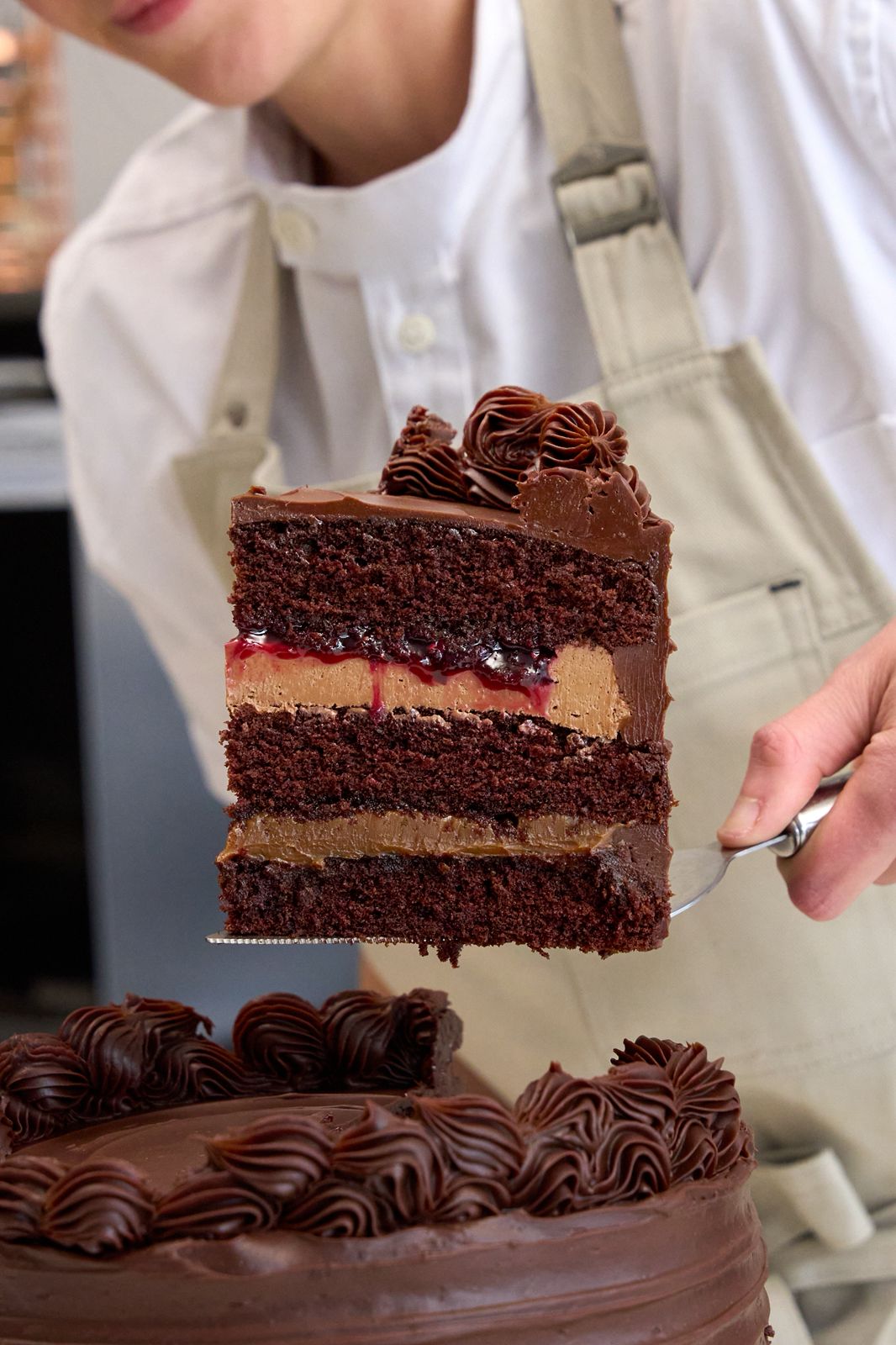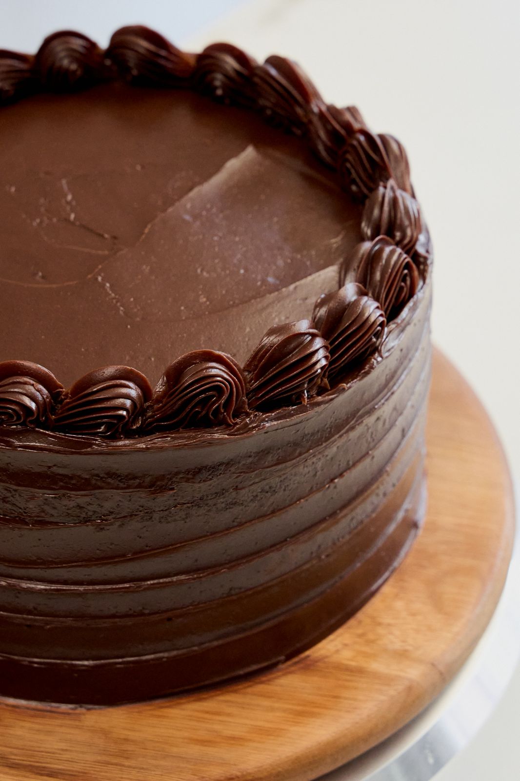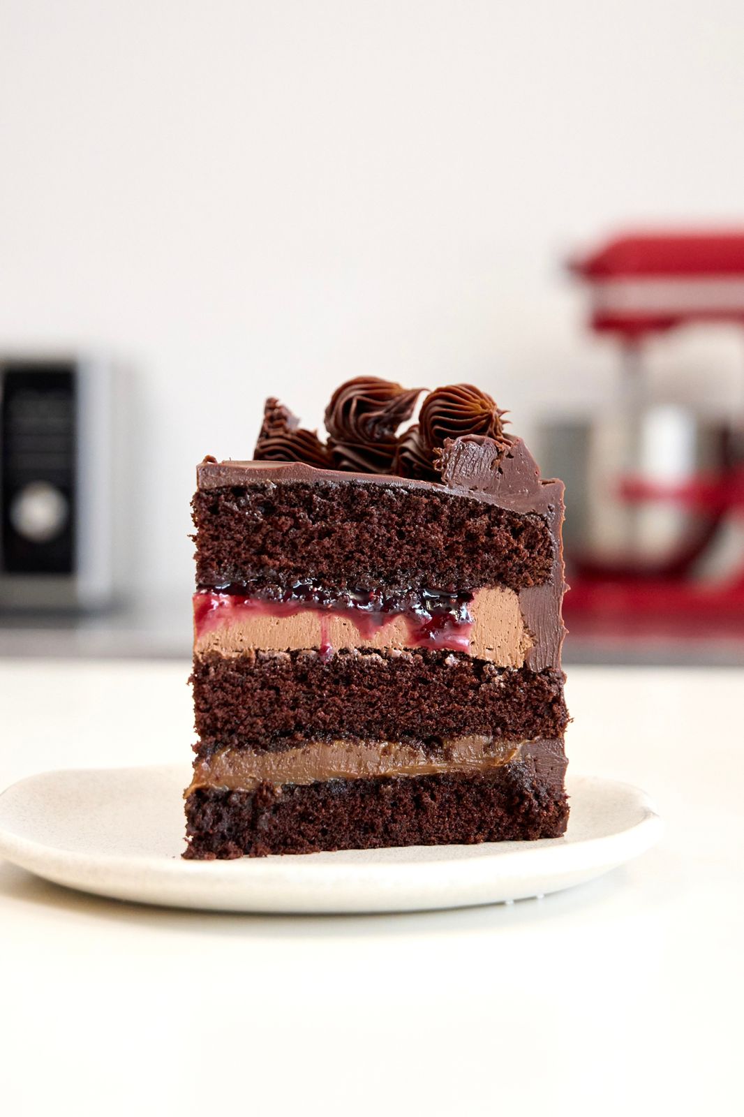 Tres bizcochos húmedos de chocolate cubiertos con una deliciosa ganache de chocolate semiamargo.