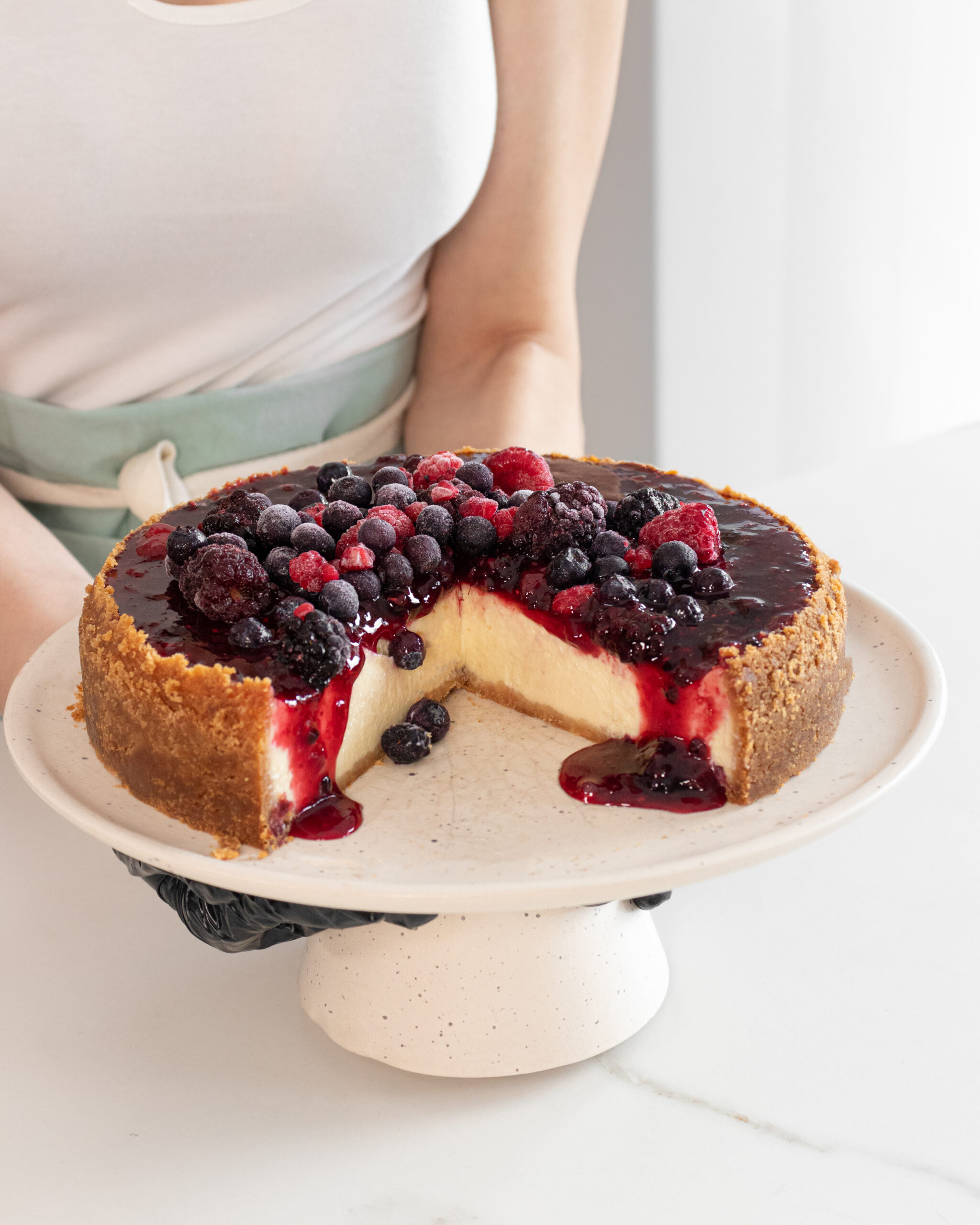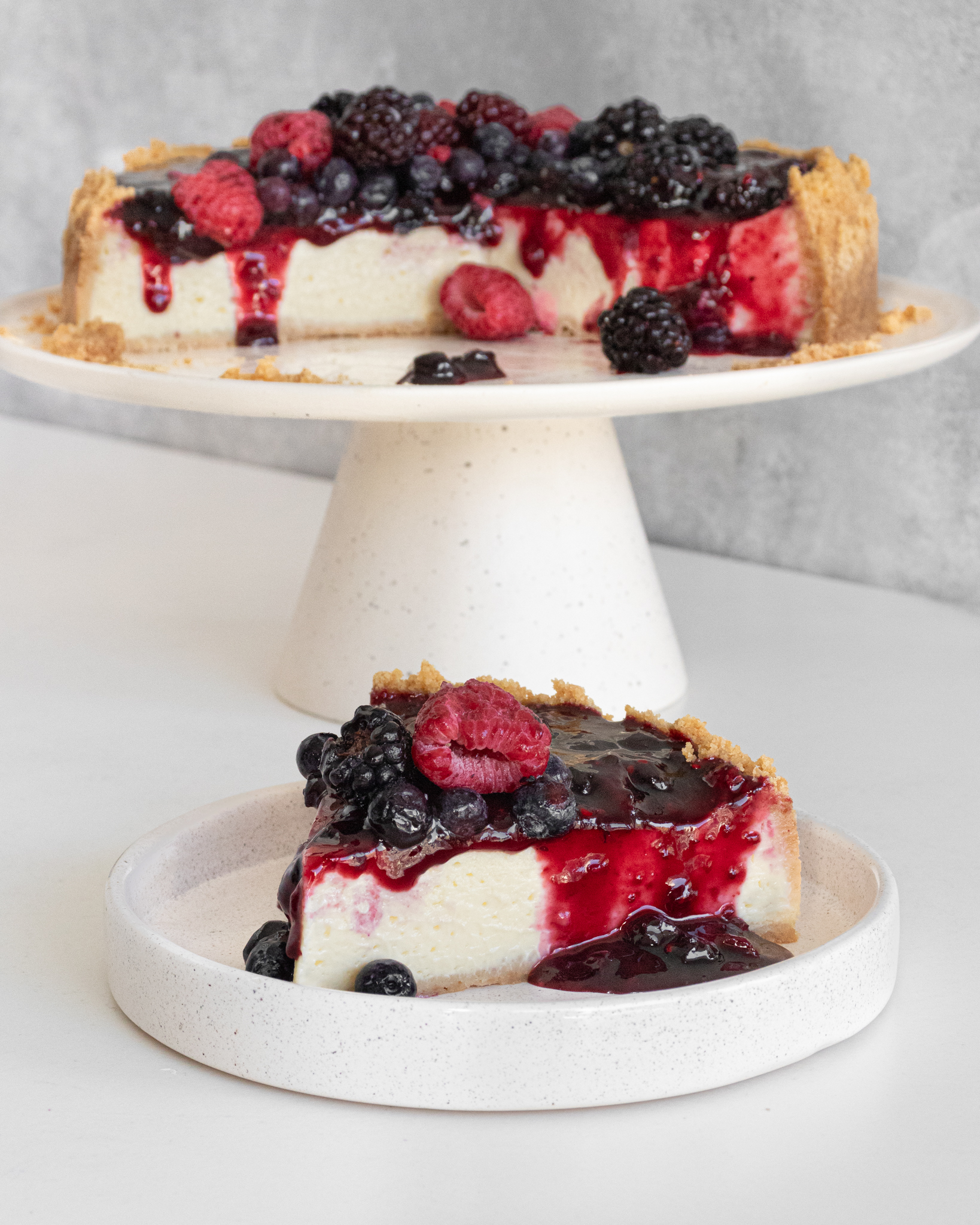 Cremosa cheesecake clásica con una deliciosa reducción casera de frutos rojos.